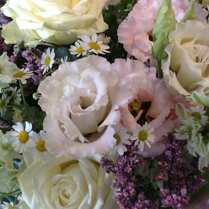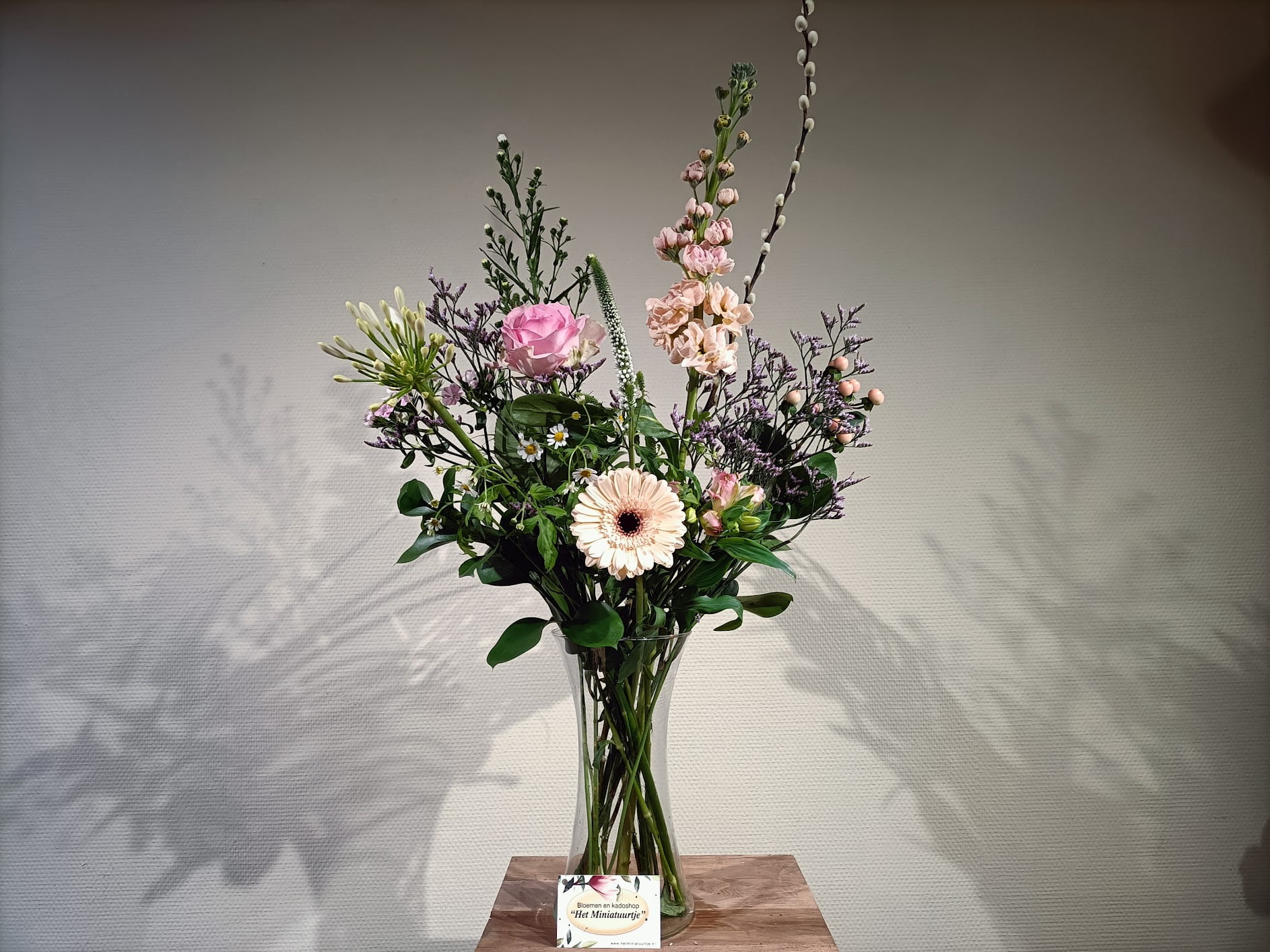 Boeket van verschillende soorten bloemen met zachte tinten.
